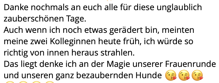 Für mich ist diese Ausbildung ein Raum zum Wachsen und fühlt sich an wie eine Reise zu den Hunden, aber auch ein Stück zu mir selbst. Zusammen mit so wunderbaren & interessanten Frauen.