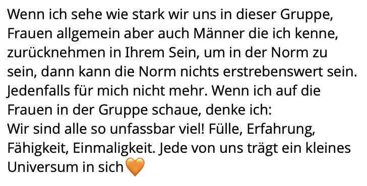 Ich merke auch immer wieder, wie viel ich aus den Fragen der anderen Frauen mitnehme. Jacquelines Impulse dazu sind für mich jedes Mal sehr bereichernd und eröffnen immer auch für mich neue Perspektiven.