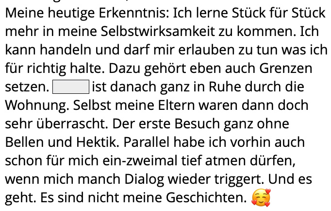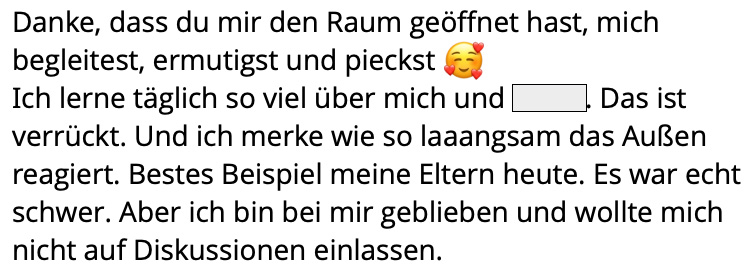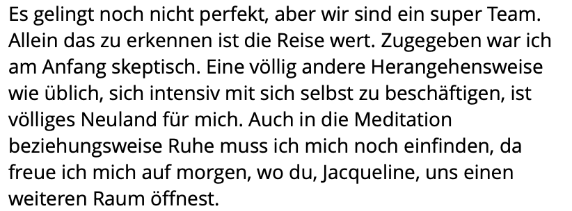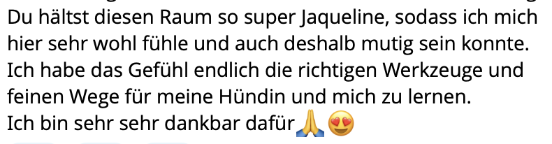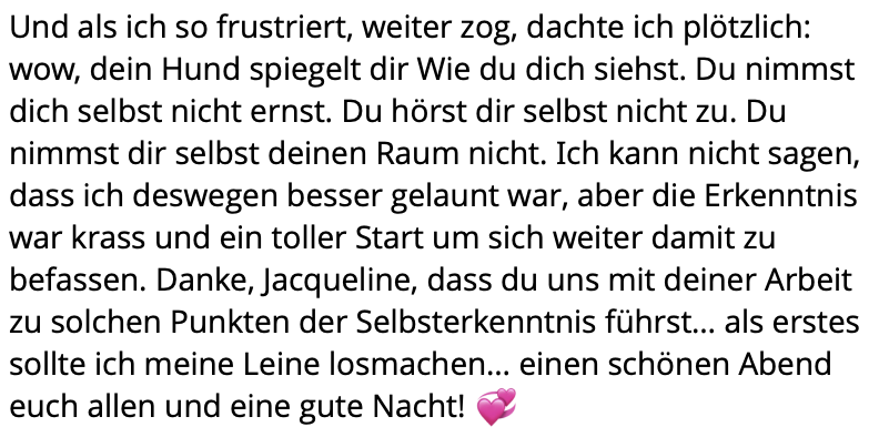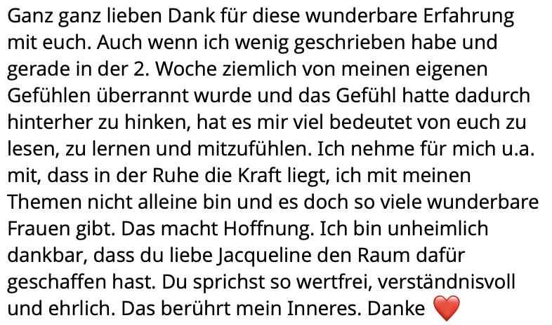 Ich kann gar nicht in Worte fassen, wie sehr ich dir für diese Erfahrung, für diesen Raum danke, Jacqueline! Mega! Krass! Heilsam! Hammer! Wunderschön! „Würdeschön“ um dieses Wort mal zu klauen…
