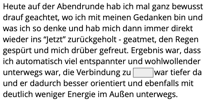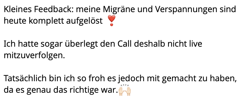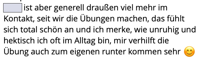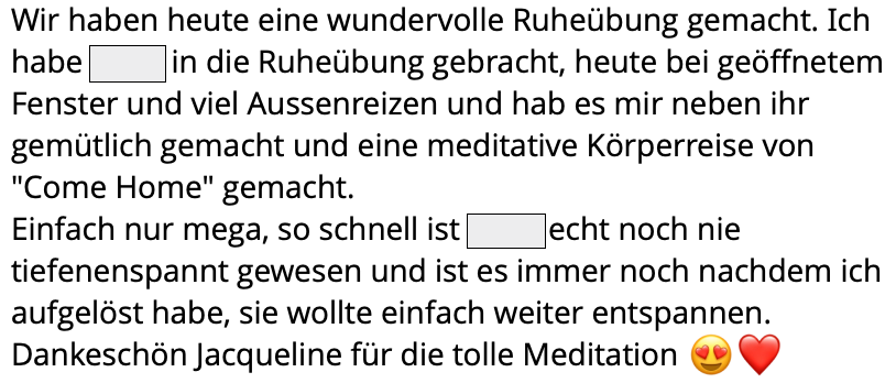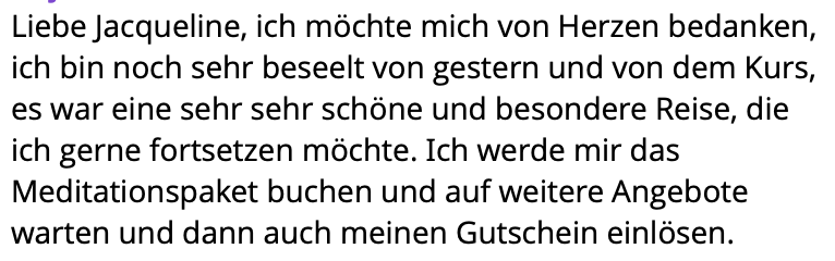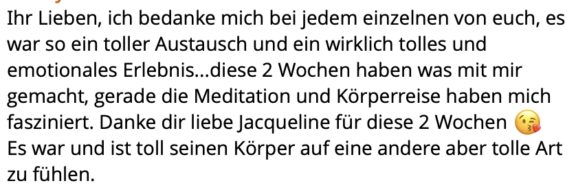 „Liebe Jacqueline und liebe Mit-Atmerinnen, ich wollte auch noch mein Erleben der Breath-Session mit euch teilen. Eine Wahnsinns-Erfahrung. Ich hatte so eine Sitzung noch nie gemacht und bin überwältigt was für eine Kraft das Atmen hat. Und zu beobachten, wie die alten „Scham-Geister“ erst wieder aus den Ecken krochen, aber recht schnell weggeatmet werden konnten. Wunderbar. Ich hatte kein Thema und war gespannt, was sich hochspülen würde.